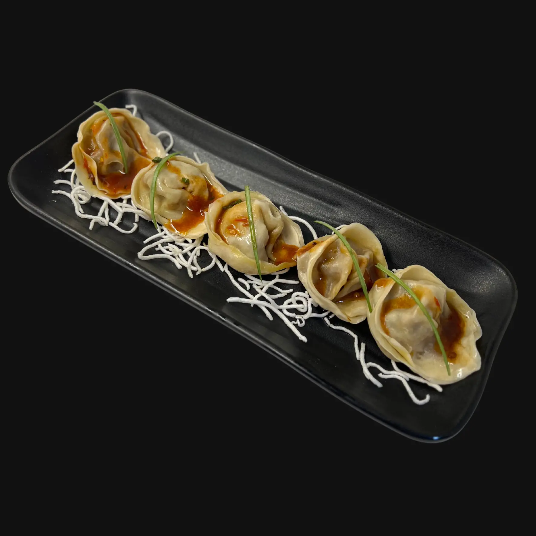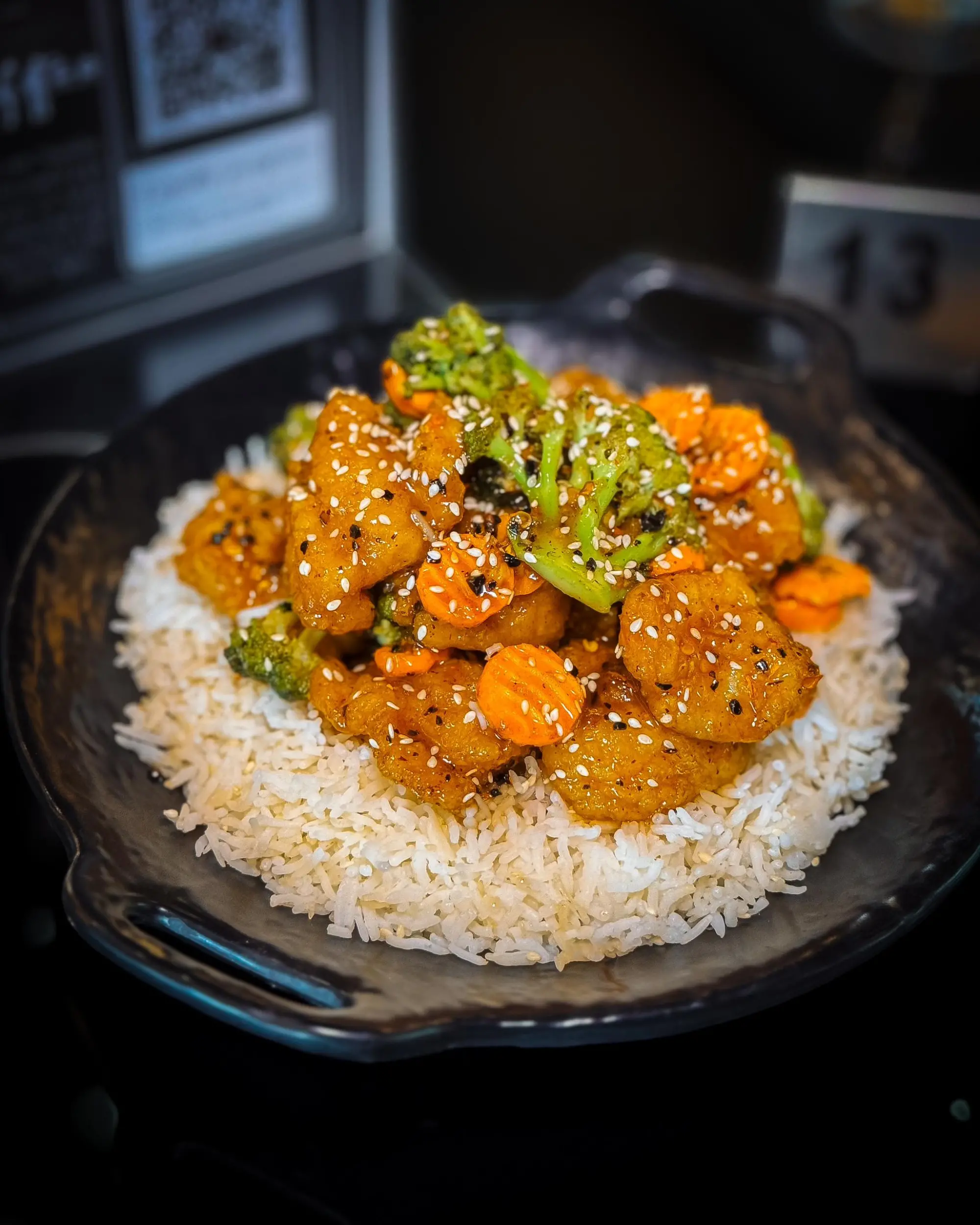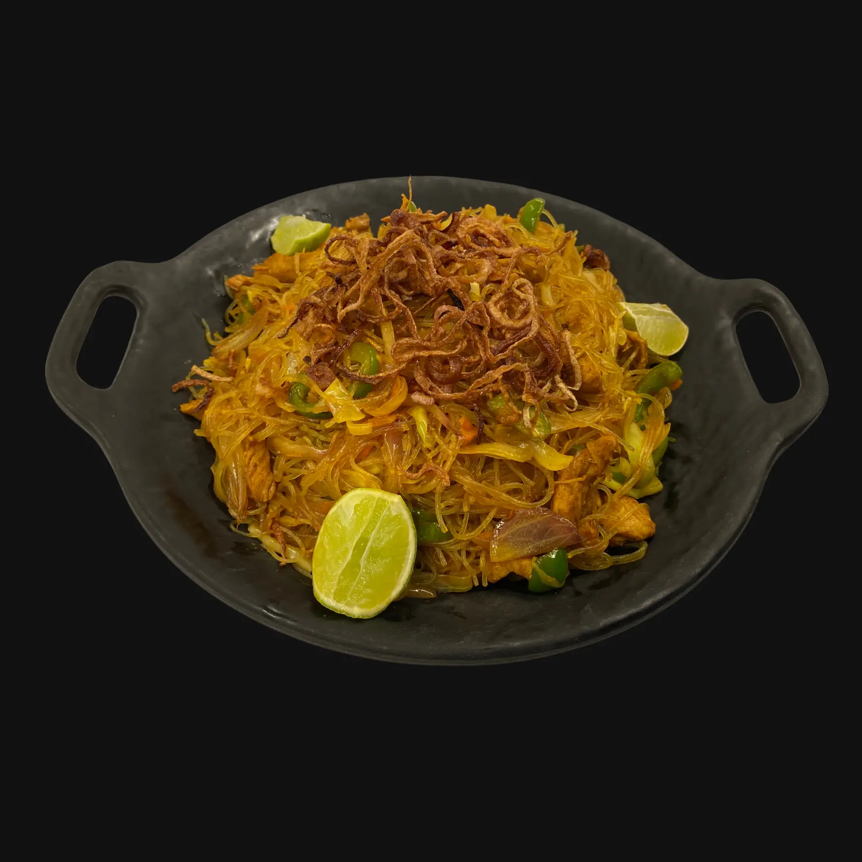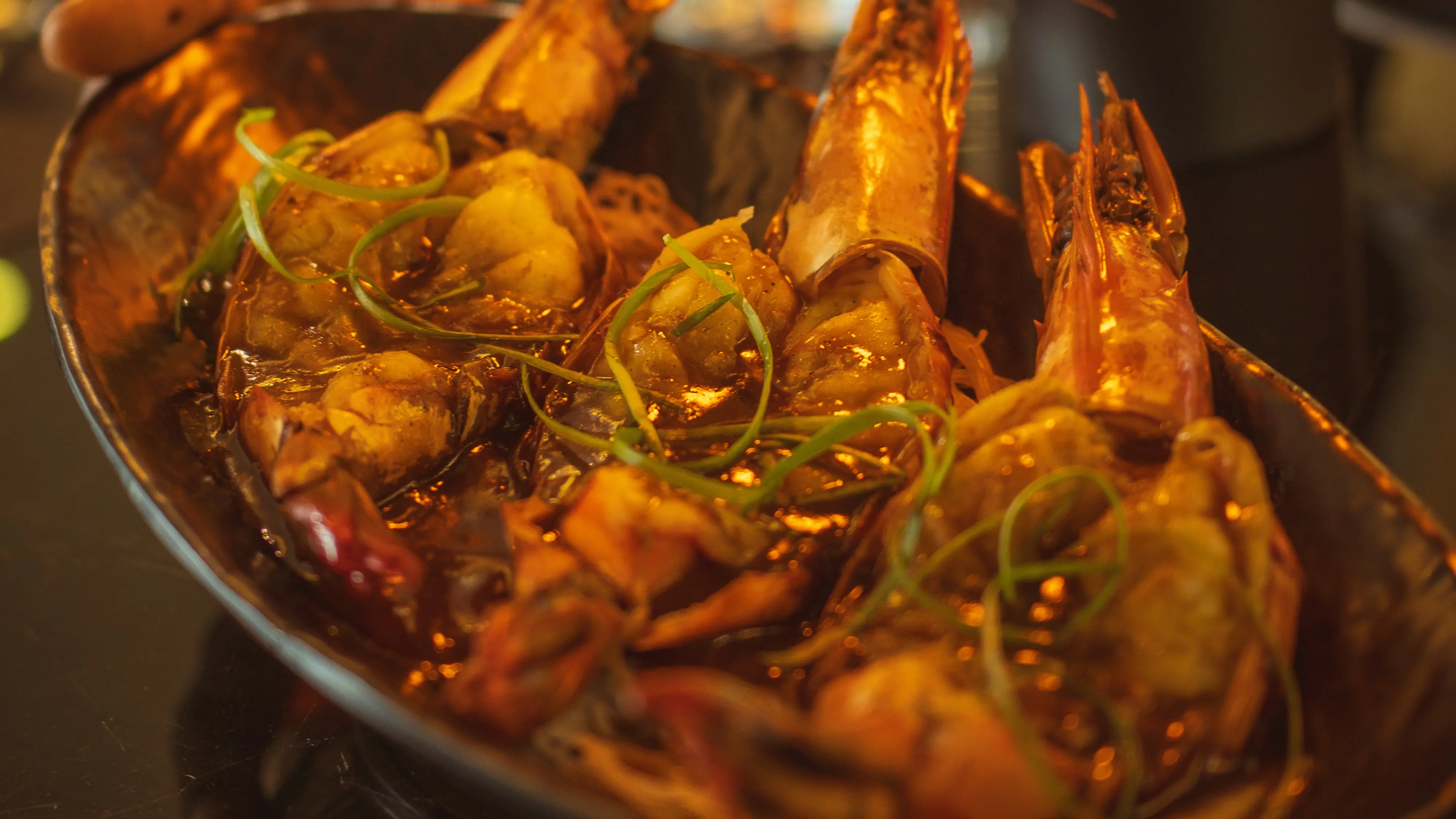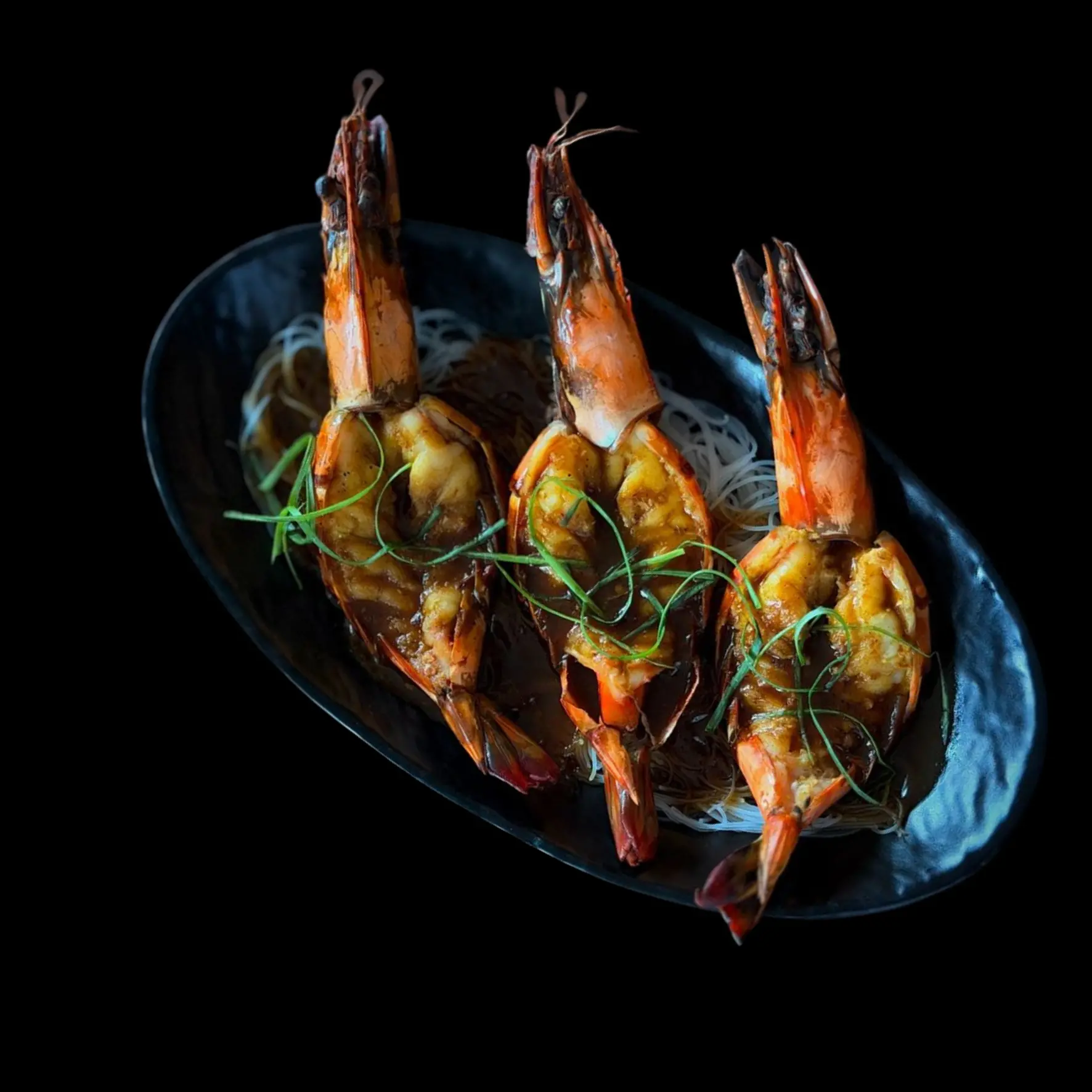 Whole Prawns marinated in Asian flavours, steamed to perfection and served on a bed of rice noodles.